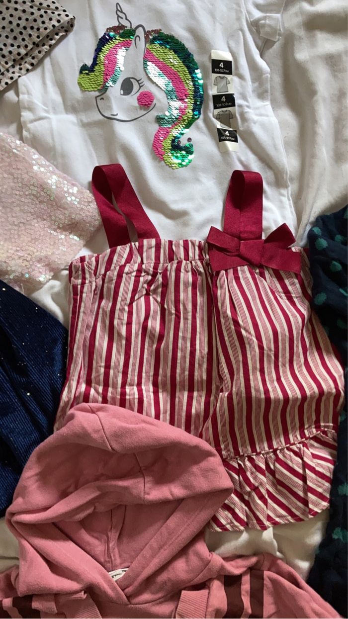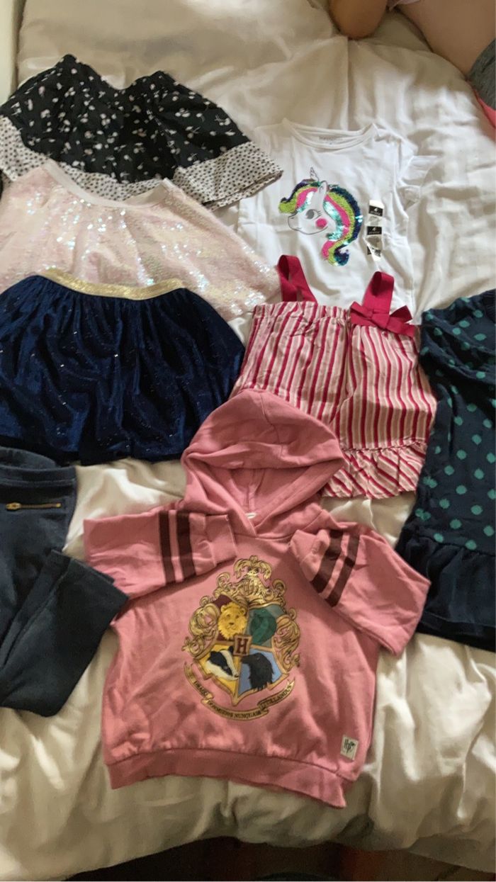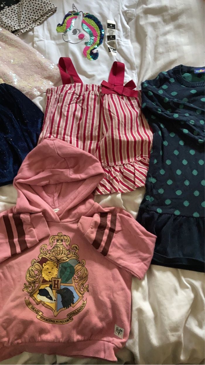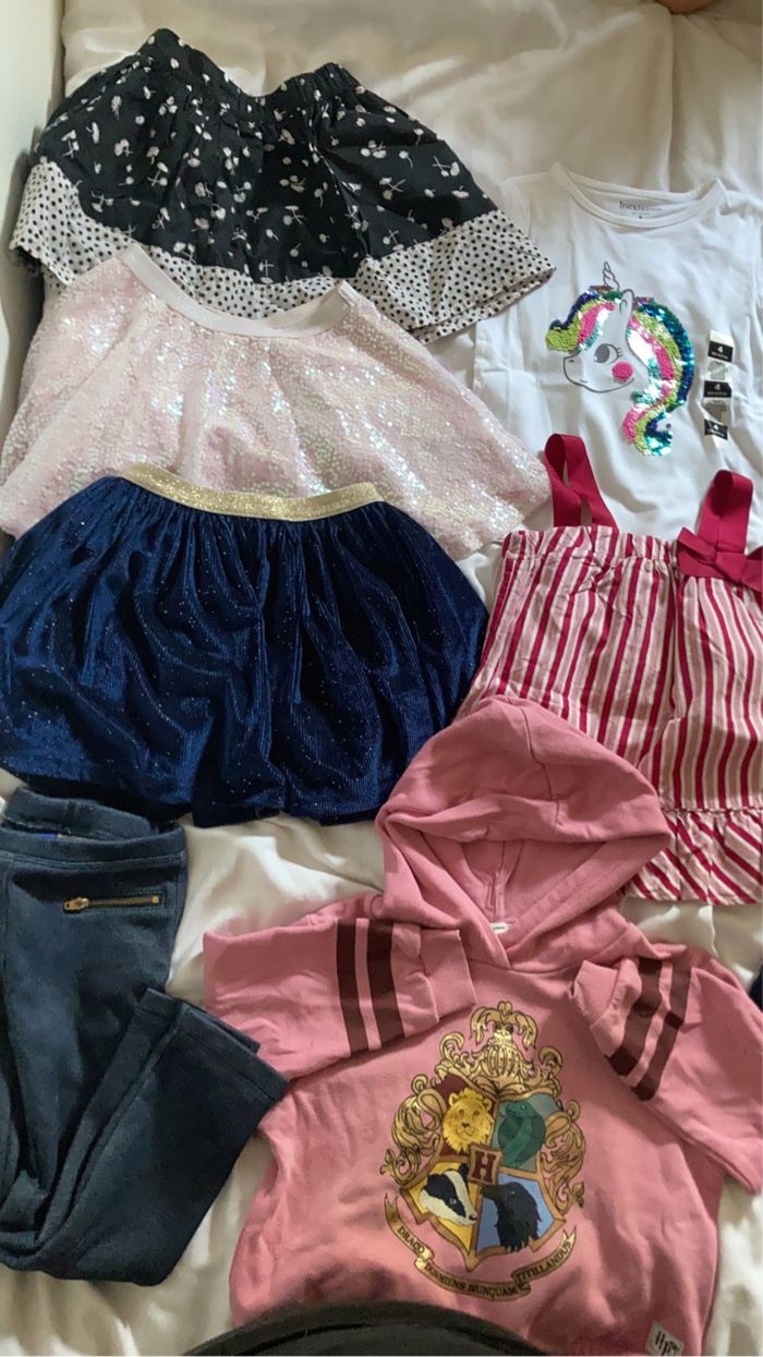 🌺Lot de 8 pièces taille 4 ans excellent état donc une jupe pat patrouille offerte. 3 jupes DPAM 1 sweat a capuche Harry Potter 1 tee shirt sequins licorne neuf avec etiquette 1 tee shirt à noeud 1 robe pull Lupilu 1 jegging moltonné Lupilu Des petits cadeaux en plus sont dans les colis 🛍️🎁🎀