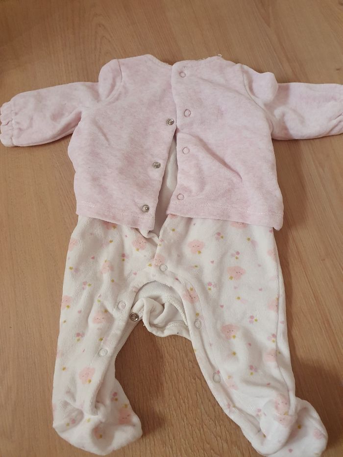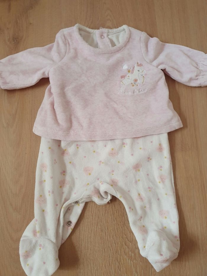 Pyjama rose en velours mis 3 fois. Ouverture entre les jambes et dans le dos. Pensez à faire un lot pour bénéficier de réductions !