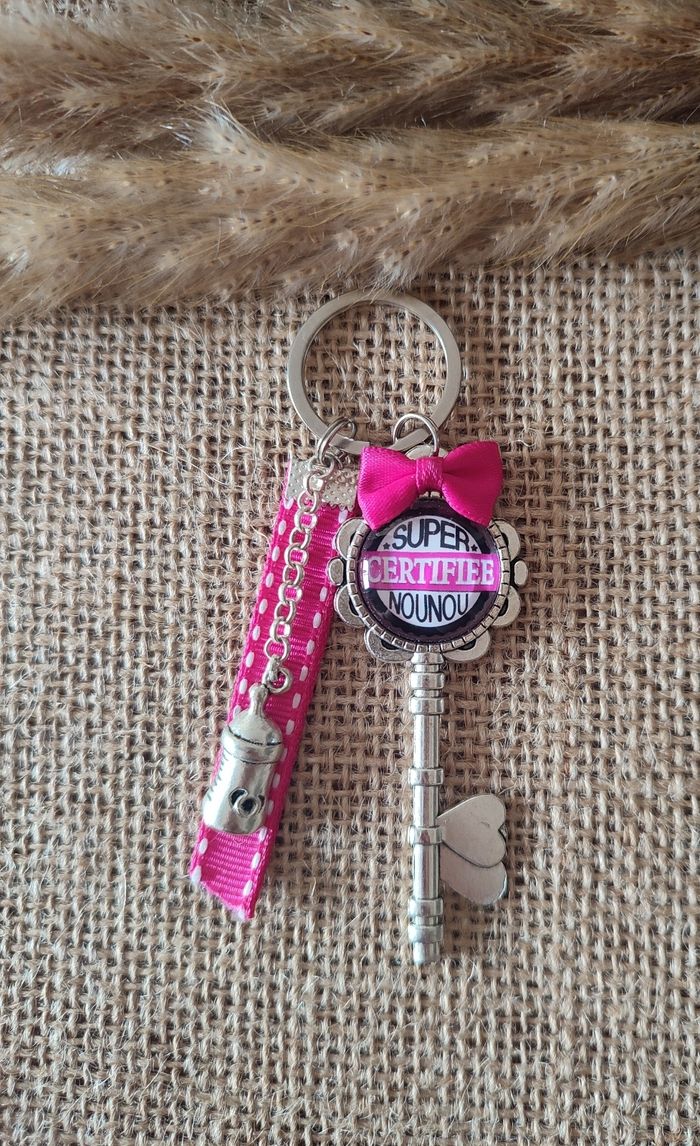 Porte-clés super nounou certifiée breloque biberon. Neuf, livré avec pochette cadeau.