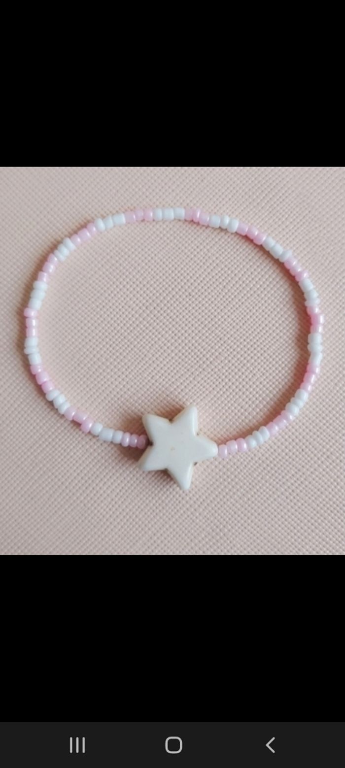Bracelet fait mais, perle rose et blanche avec une etoile au milieu. Fait pour un poignée de 12 cm. Si vous souhaitez d'autre couleur ou une autre taille de poignée n'hésitez a me contactez.