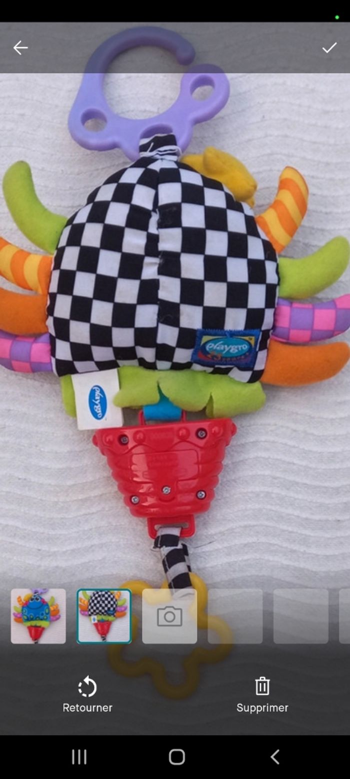 Crabe en tissu de couleur bleu avec les pinces de couleurs orange , vert , rose à carreaux mauve et orange rayé jaune Au dos cadriller noir et blanc Étoile jaune sur la tête Pour déclencher la musique tiré sur l anneau en forme de fleur Peu s accrocher sur un lit , une poussette ou autres grave à son anneau large