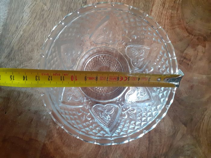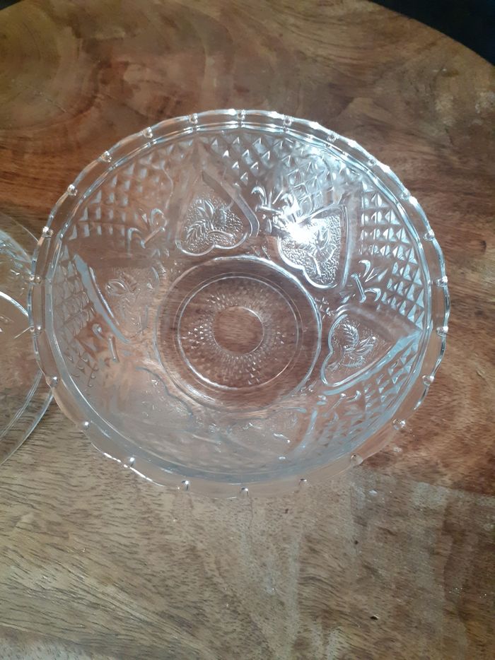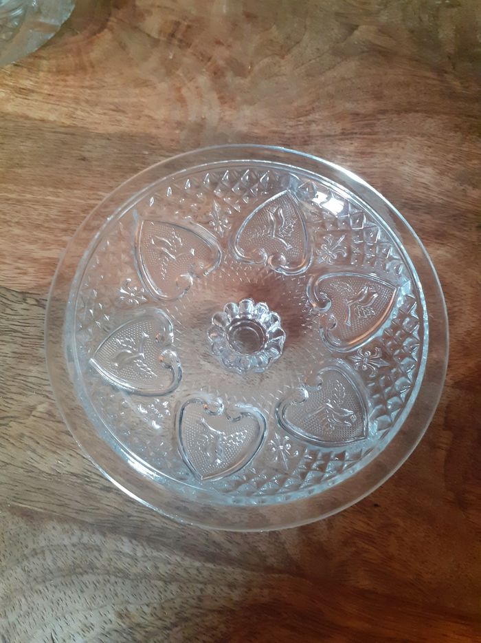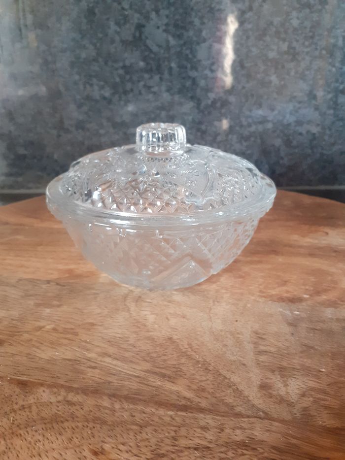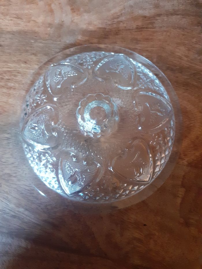 Bonbonnière / pot avec couvercle en verre transparent Motifs cœur Très bon état Diamètre 13 cm Hauteur 5,5 cm