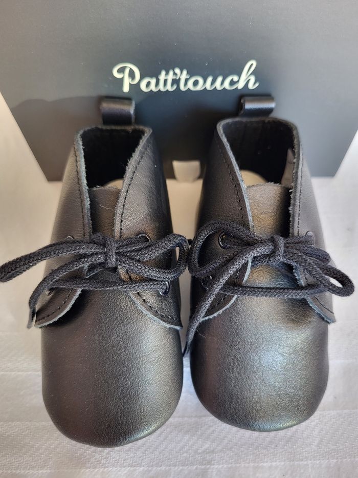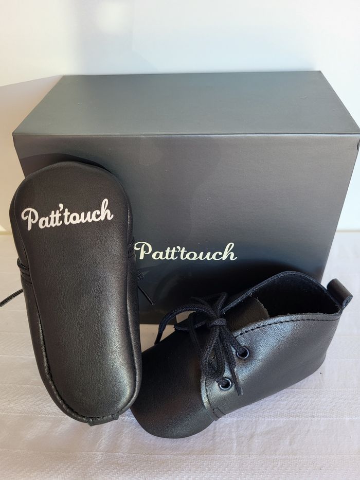 Chaussures pour bébés couchés de très belle qualité, tout en cuir lisse souple noir, non doublé, semelle intérieure en cuir blanc, de la marque PATT'TOUCH, entièrement dessinées et fabriquées dans le sud-ouest de la France Pointure 20 (6-12 mois) Longueur de la semelle intérieure environ 11 cm Emballage en coffret gris avec ruban écru au nom de la marque Déstockage à prix cassés, idéal pour offrir ou se faire plaisir ! Neuves, jamais portées Envoi sous 24h