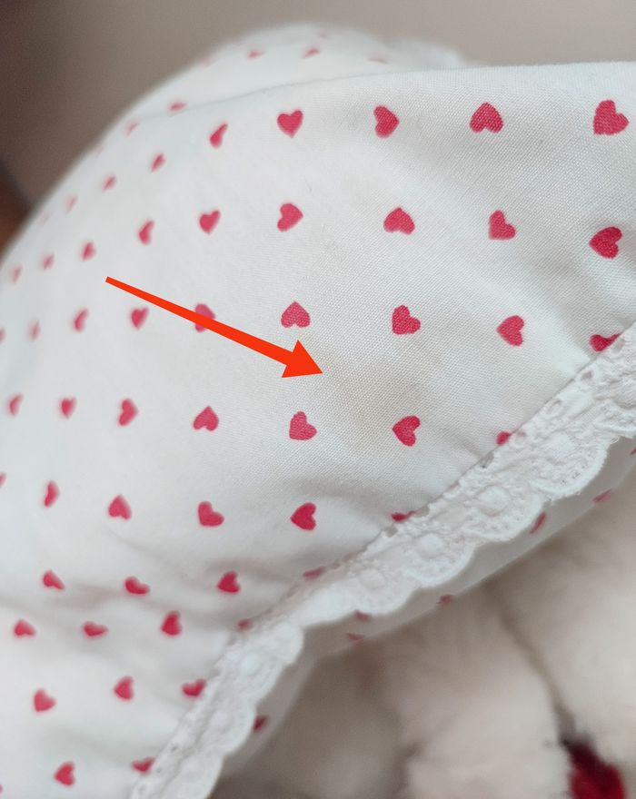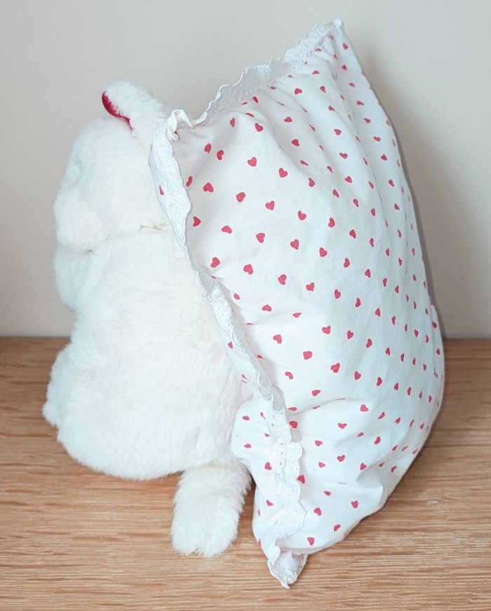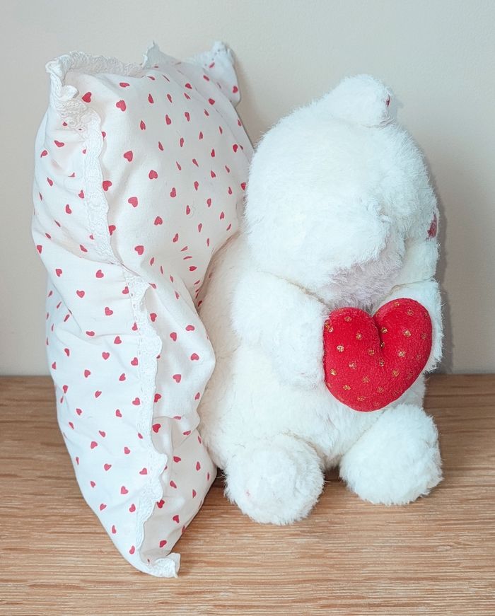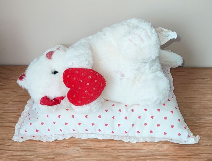 Chaton en peluche avec son coussin - Chaton blanc et coeur rouge dans ses pattes - Coussin rectangulaire blanc à petits coeurs rouge et dentelle - Dimensions : • Chat : 22 cm • Coussin : 28 cm ❌ Excellent état, malgré une tâche sur le dessous du coussin (voir dernière photo) [ #chatonenpeluche #peluchechat #peluchechataveccoussin #coeur #pelucheenfant #chatblancpeluche #chatcoeur #peluchecoeur #doudouenfant #decorationenfant #decorationmamie #passionchat #collectionchat ]