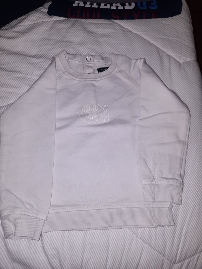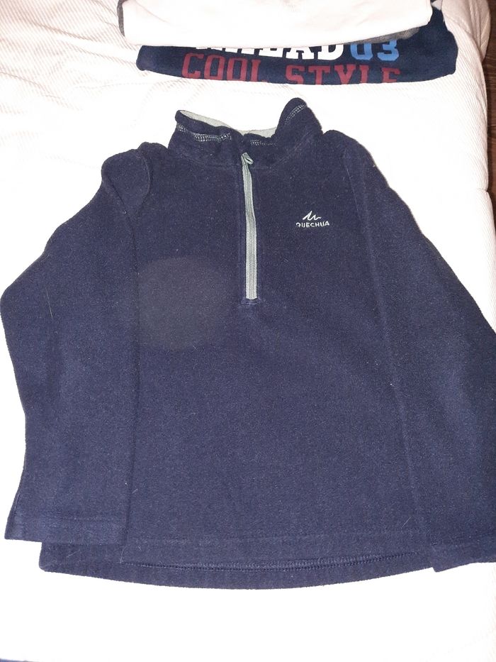 Lot de 4 pulls sans capuche Taille 3 ans ou 36mois ( le blanc de chez kiabi) Le blanc a une petite tâche bleu sur l'arrière de la manche mais le tout reste en très bonne état