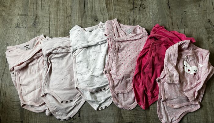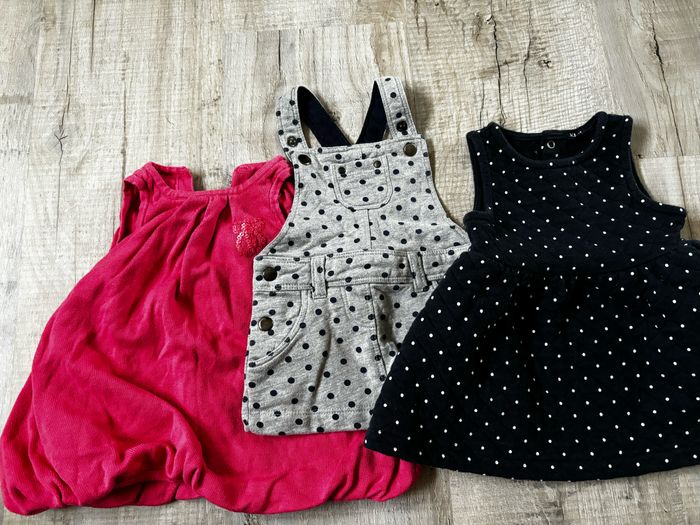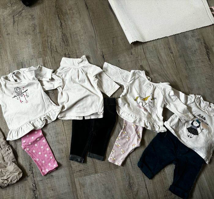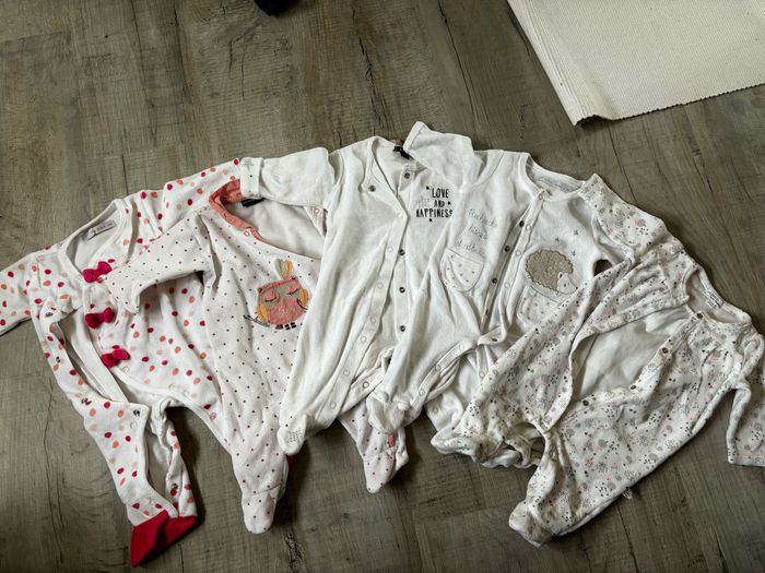 Lot comprenant : - 4 tenues complètes - 5 pyjamas - 3 robes - 2 pantalons - 6 bodies manches longues