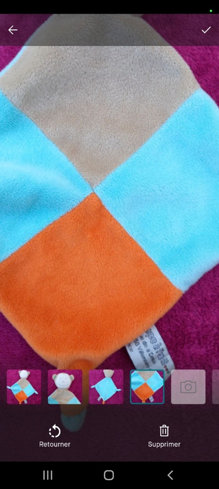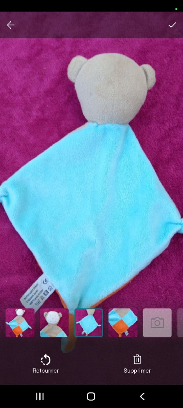 Doudou singe avec noeuds dans les coins en velours de couleurs orange,bleu ciel et brun et au dos que du bleu Matiere : 100% polyester Bon état