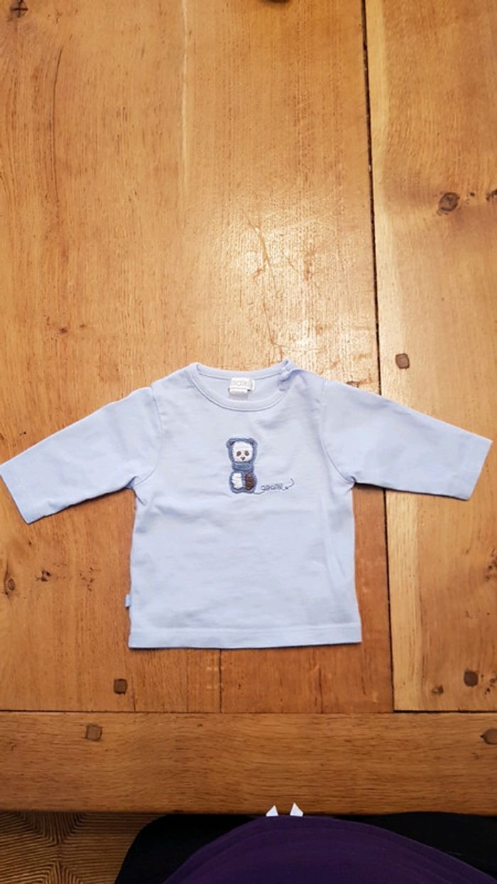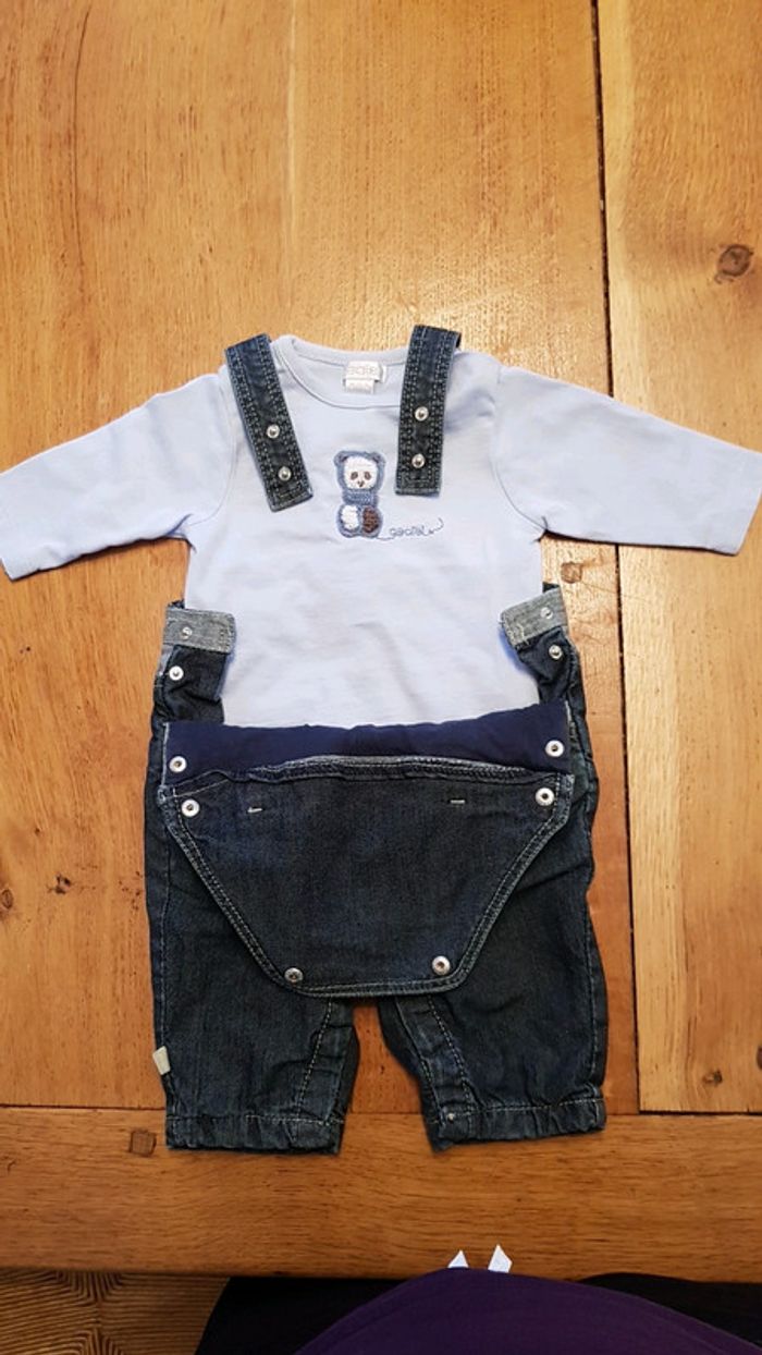Ensemble salopette + tee-shirt manche longue En très bon état. Marque obaïbi Ouverture entre jambes de la salopette. Taille 1 mois