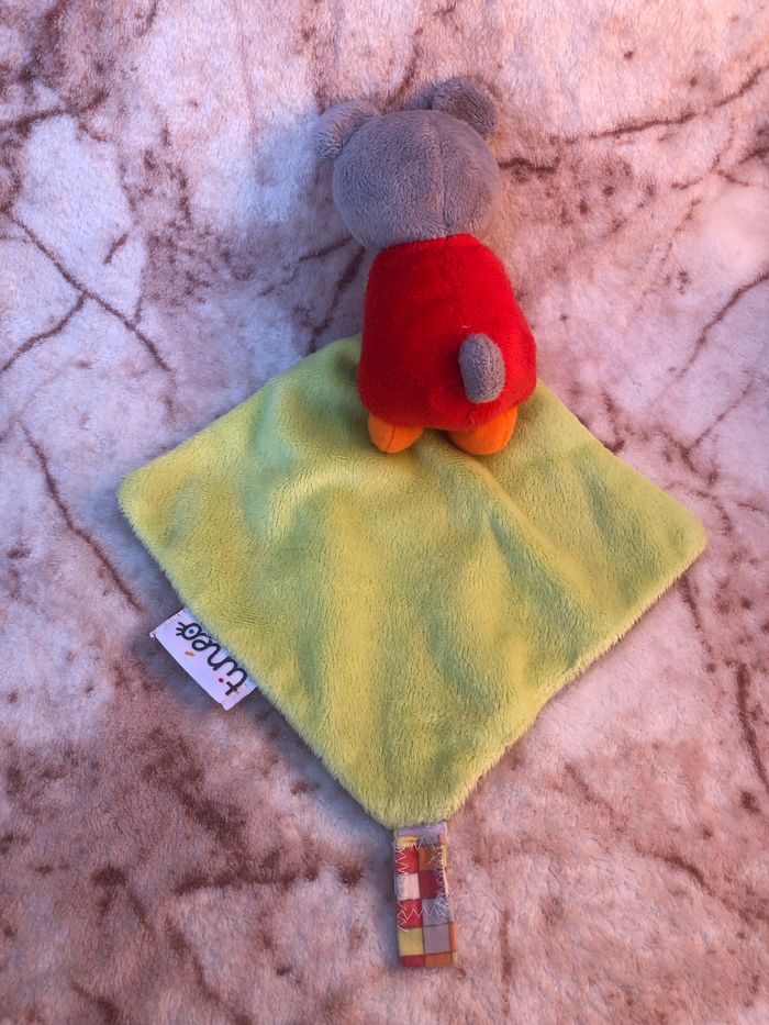 Doudou ours gris mouchoir gris vert rouge motifs: rond carreaux et spirale Tinéo Occasion en très bon état Vous achetez le doudou que vous voyez sur la photo