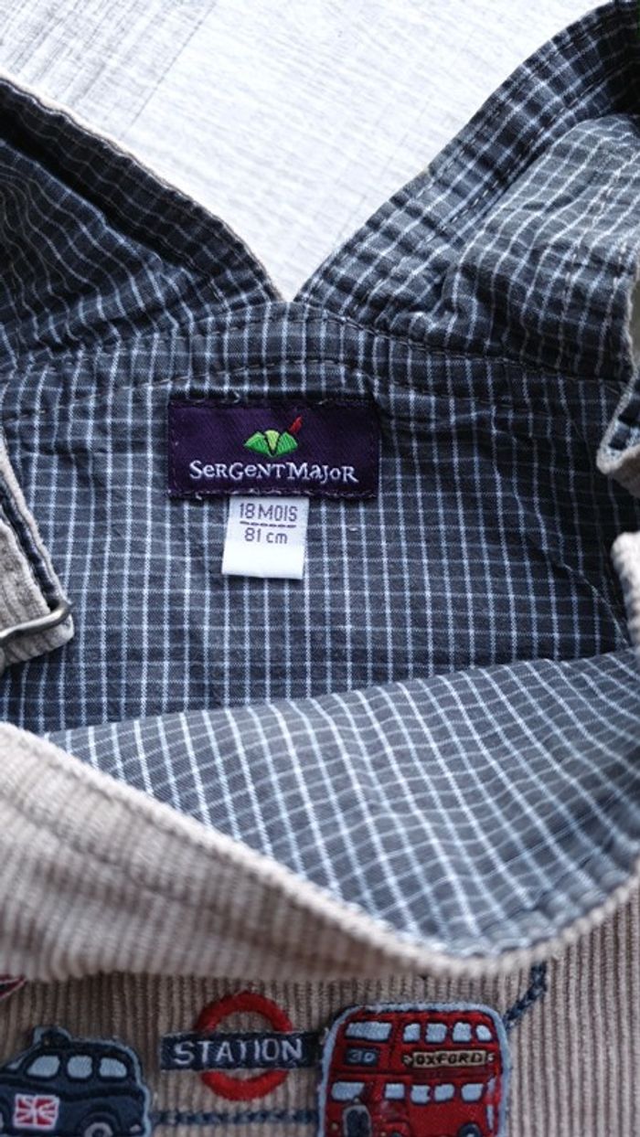 Salopette Taille 18 mois Bon état, il manque seulement une pression en bas de la jambe gauche Système de pression entre les jambes pour le changement de couche. Bretelles réglables Marque Sergent Major