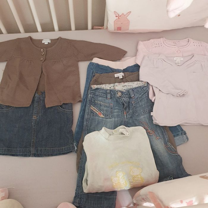 Lot 12 mois (2 pantalons, avec 1 jeans de marque diesel un petit sous pull, 2 veste , 1 pyjama et 1 jupes en jeans)