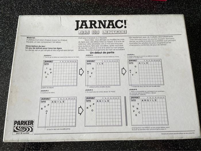 Jeu Jarnac! Parker «  un mot peut en cacher un autre alors gare aux coups de Jarnac «  Années 70-80 Règle du jeu manquante Trace d’usures