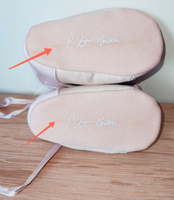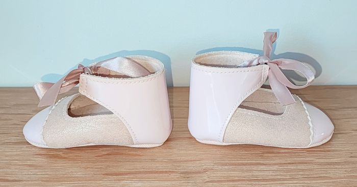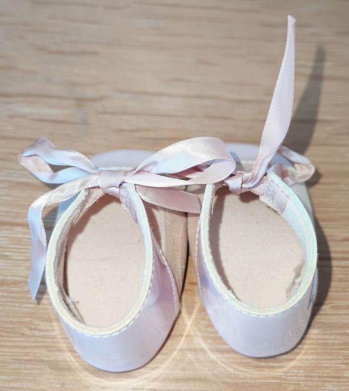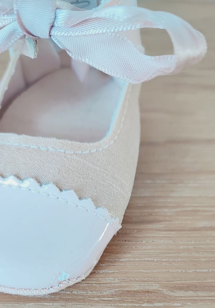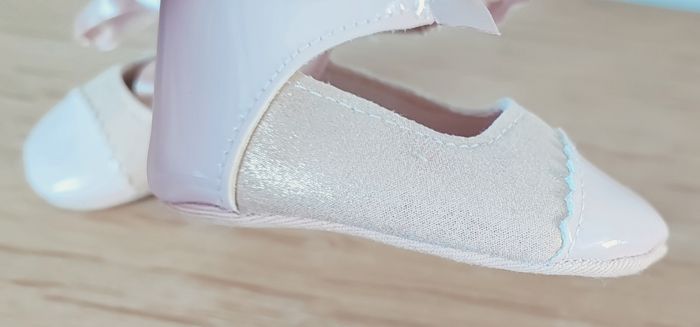 Ballerine bébé de la marque P'TIT BISOU - Vernis Rose poudré - Matière pailletée sur le dessus - Ruban satiné à nouer - Pointure : 16 (9,7 cm) 0/3 mois ❌ Bon état, car le devant est abîmé à un endroit et la semelle du dessous est tachée d'un trait sur chacune des chaussures (voir photo) [ #ballerinebebe #chaussure16fille #fille0_3mois #bebefille #ptitbisou #pointure16 #chaussonbebe16 #naissancefille #fille1mois #fille3mois ]