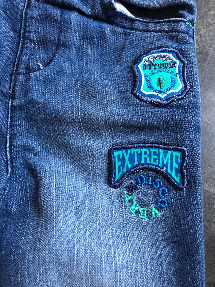 Joli pantalon en jeans bleu Écussons et revers vert Taille 12 mois 74 cm 70% coton 30% polyester Orchestra