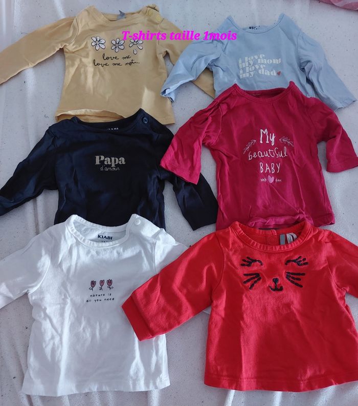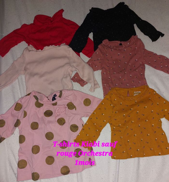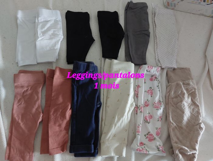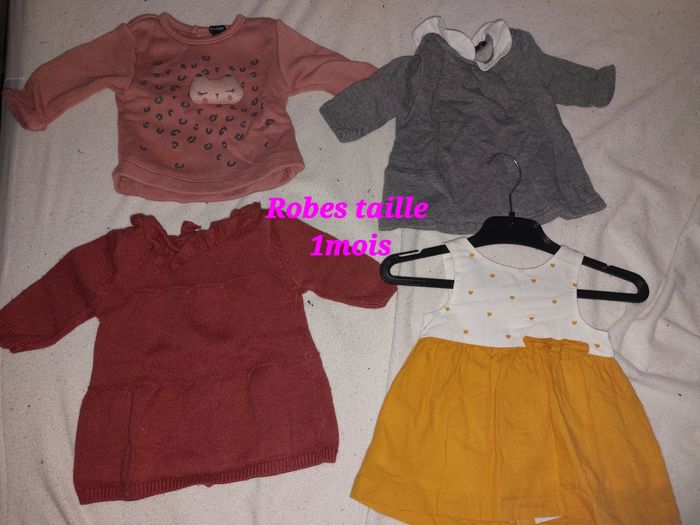 Lot vêtements fille taille 0-1 mois comprenant : * 2 gilets Kiabi * 1 robe et sa culotte assortie Zeeman * 1 jupe + legging accroché Prémaman * 6 T-shirts avec petit col Kiabi * 1 ensemble brassière + pantalon Zeeman * 1 ensemble t-shirt + salopette Kiabi * 6 t-shirts longues manches Kiabi * 12 leggings/pantalons diverses couleurs * 4 bonnets et 3 paires de moufles naissance * 6 pyjamas velours taille naissance * 6 pyjamas coton taille 1 mois * 1 combinaison été * 3 pyjamas velours taille 1 mois * 4 robes taille 1 mois Kiabi * 2 ensembles Robe + legging * 1 ensemble robe + collant taille 13/14 * 3 gilets (bleu marine, blanc et rose) * 1 sweat * 1 peignoir de bain * 7 bodys longues manches taille 1 mois * 2 bodys longues manches taille 0 mois * 6 bodys courtes manches taille 1 mois * 7 bodys courtes manches taille 0 mois Tout est parfait état sans trou ni tache 8 Les autres photos sont possible à la demande