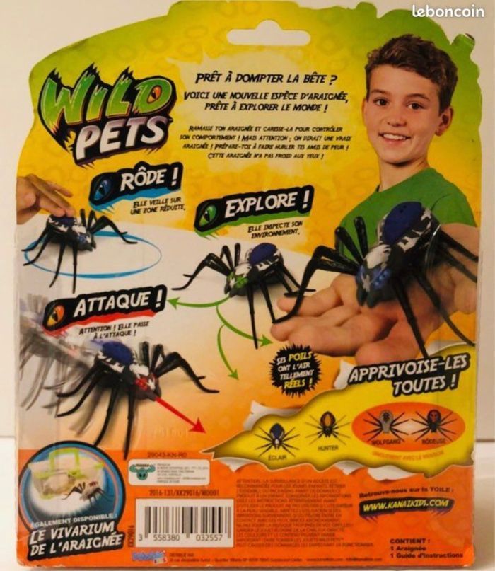 NEUF wild pets robot mygale araignée interactive lumineuse noire jaune Lot SOP77 A saisir : 12€ - NEUF SOUS BLISTER DESCRIPTION : Prêt à dompter la bête ? Muni de capteurs sensibles et de LED lumineuses 3 couleurs, cette araignée ultra-réaliste se déplace seule, plus ou moins rapidement selon le mode sélectionné. Elle peut être calme ou effrayante, se promener ou attaquer. Ses 8 pattes bougent et ses yeux changent de couleur selon son humeur. Attention on dirait une vraie araignée ! Cette araignée est une vraie terreur ! 4 araignées différentes à collectionner Fonctionne avec 1 pile LR44 (pile de démonstration incluse) Dimensions : 6,2 x 18 x 21,8 cm Age : 5-12 ans Expédition sous 24-48h Remise en mains propres possible à MEAUX (77100) quartier de la gare ou à : . Trilport, Varreddes, Germigny-l’Evêque, Lizy sur Ourcq et May Acy en Multien. . Chauconin, Monthyon et Saint Soupplets . Chessy TGV Serris / Marne-la-Vallée / Val d'Europe / Claye-Souilly et Villeparisis