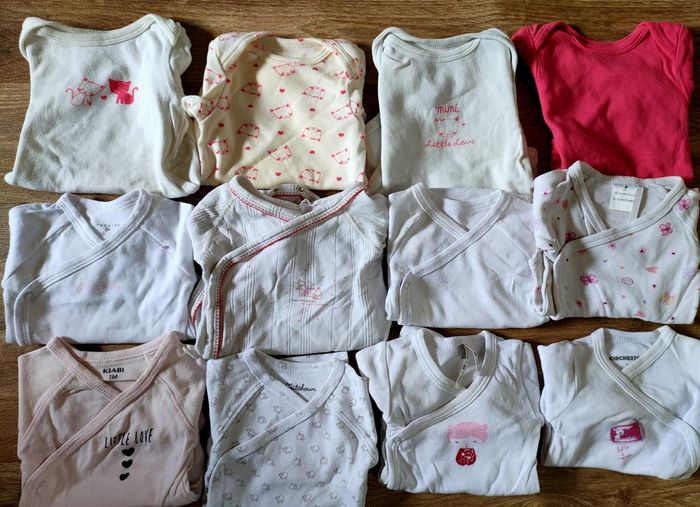 Vend lot de 12 body fille taille 1 mois, 4 manches courtes et 8 manches longues (+1 pyjama offert avec le lot)