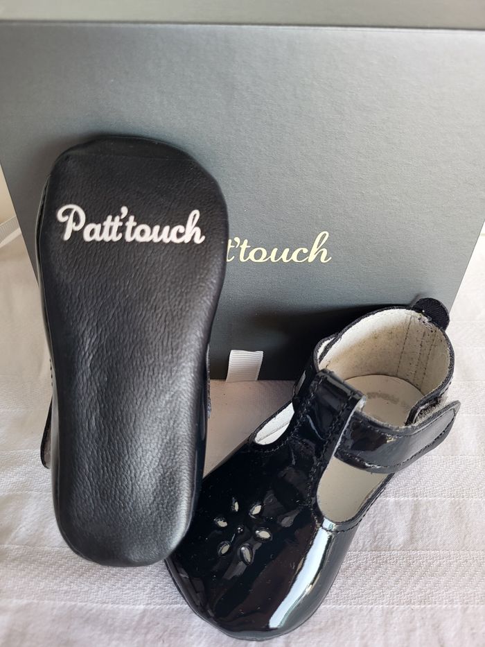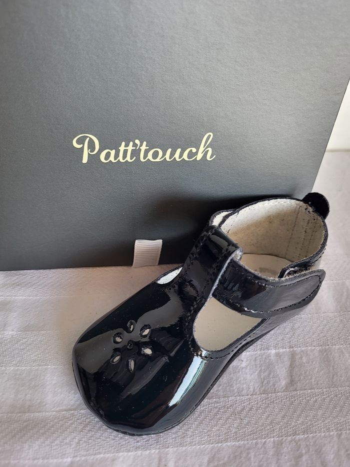 Chaussures pour bébés couchés de très belle qualité, tout en cuir vernis souple noir, doublure non-tissé, semelle intérieure en cuir blanc, semelle extérieure en cuir noir, de la marque PATT'TOUCH, entièrement fabriquées en France Fermeture bride velcro Pointure 20 (6-12 mois) Longueur de la semelle intérieure environ 11 cm Emballage d'origine en coffret gris avec ruban écru au nom de la marque Neuves, jamais portées Envoi sous 24h