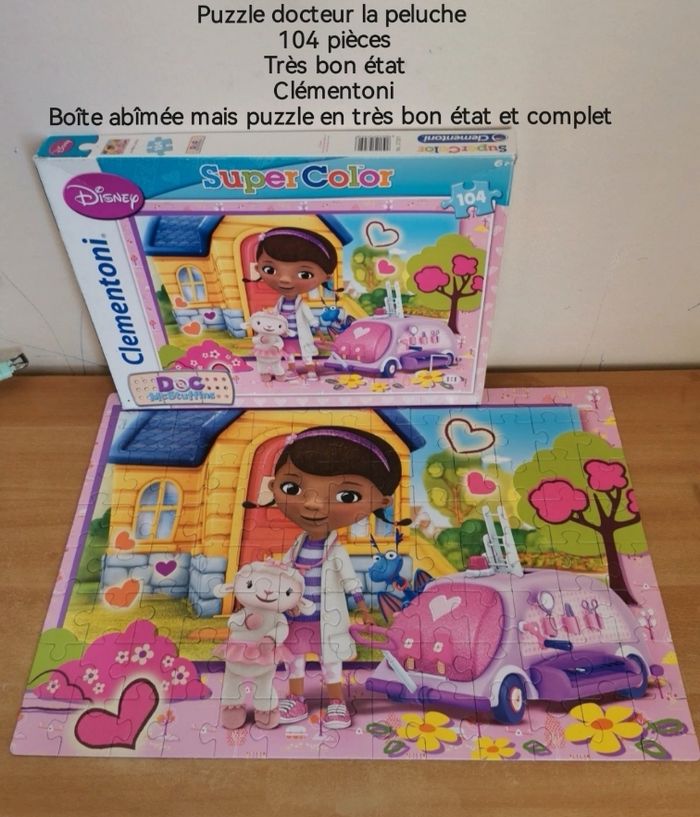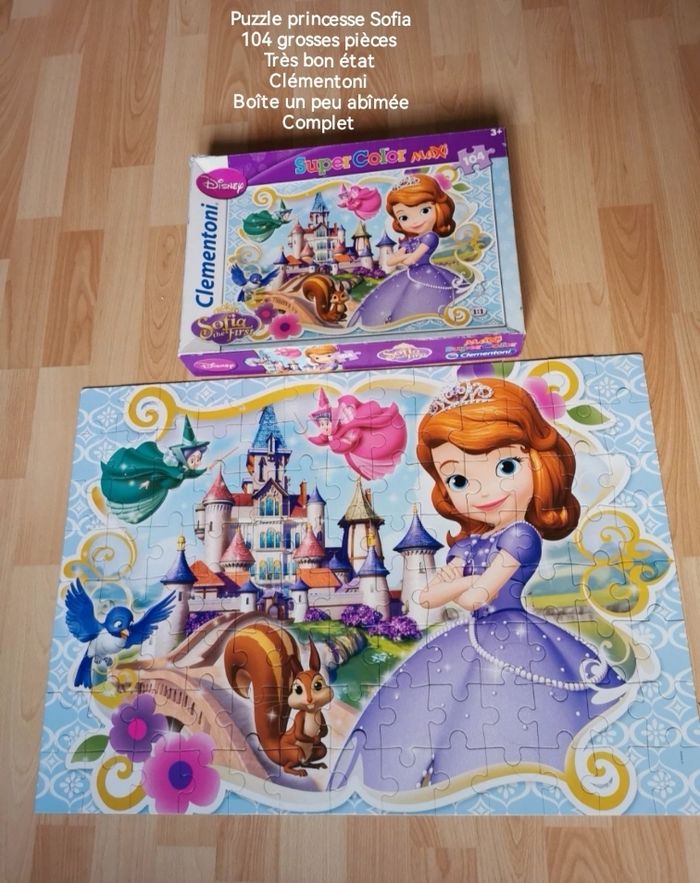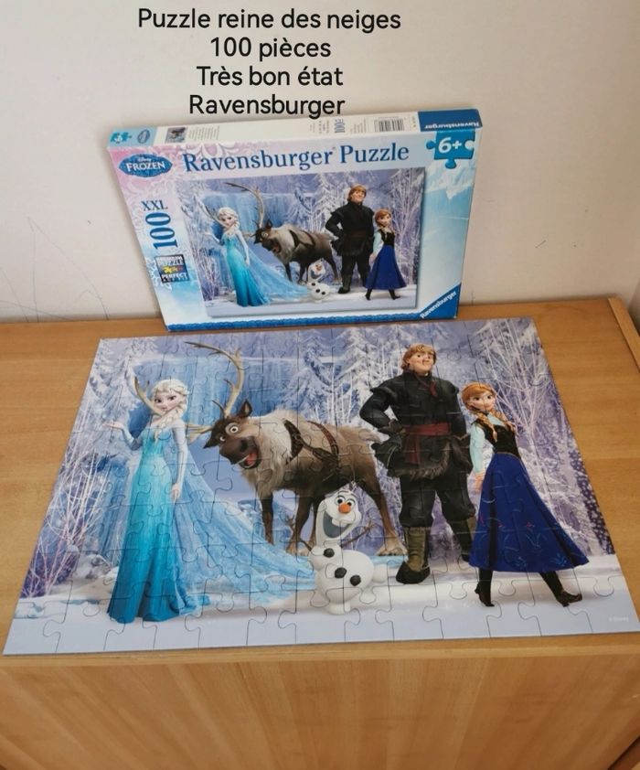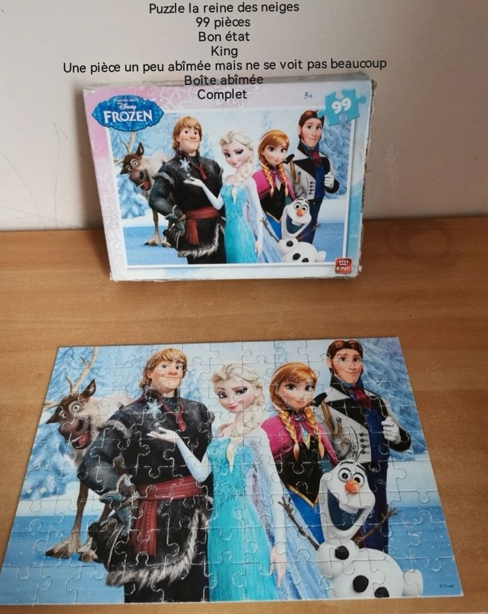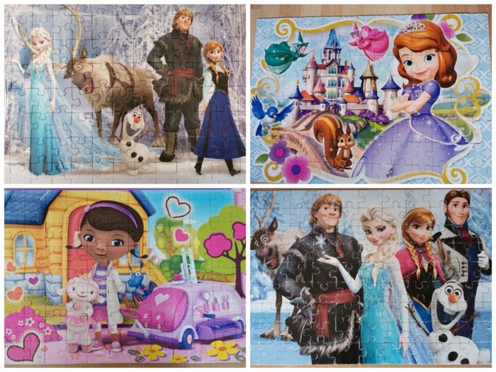 Lot 4 puzzles 99 et 100 pièces. -Puzzle Reine des neiges 100pieces. Très bon état. -Puzzle Princesse Sofia, 104 grosses pièces. Très bon état. Boîte un peu abîmée. -Puzzle Docteur la Peluche, 104 pièces. Puzzle en très bon, boîte abîmée. -Puzzle La Reine des Neiges, 99 pièces. Une pièce un peu abîmée mais ne se voit pas beaucoup. (photo) boîte abîmée. Bon état.