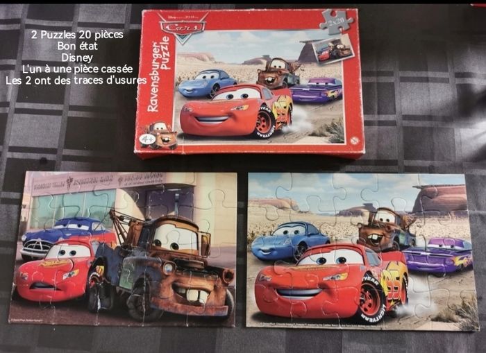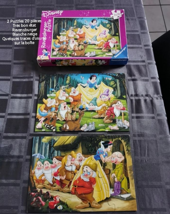 Lot 4 puzzles 20 pièces. -2 puzzles Blanche neige très bon état. Quelques traces d'usures sur la boîte. -2 puzzles Cars. L'un à une pièce cassée, les 2 ont des traces d'usures. Bon état.