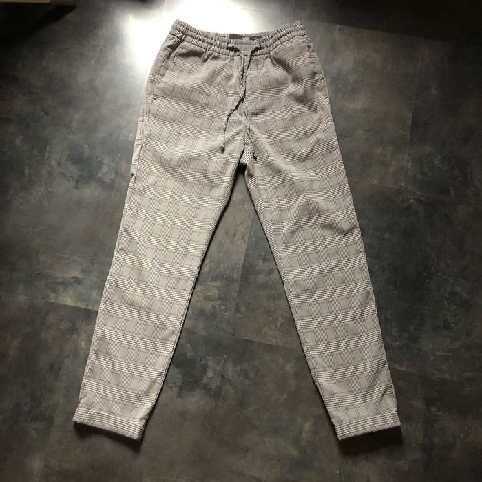 Pantalon jeggpant prince de galles Ceinture élastique 4 poches Revers en bas des jambes Plus d’étiquette de composition, sûrement un bon pourcentage de polyester car ne nécessite pas de repassage Taille XS slim fit H&M Peu porté La ceinture mesure à plat sans tirer 35 cm, va jusqu’à 41 cm en tirant Longueur entre jambes 69,5 cm Largeur à plat bas des jambes 16 cm