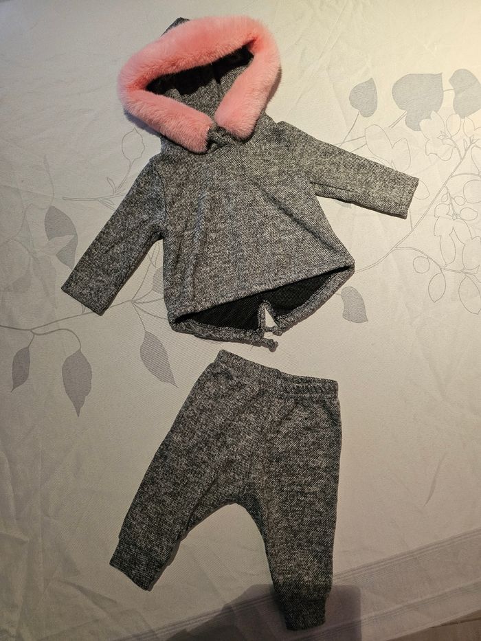 Joli ensemble fin et chaud. Tissu doux et capuche avec fausse fourrure hyper douce. Haut resserrable par cordon à attacher derrière. Bas élastiqué à la taille. ⚠️ ATTENTION : le haut est en 6 mois, permettant de mettre un pull léger dessous par exemple. Le bas est en 3 mois. Porté deux ou trois fois, il est en excellent état, hormis un minuscule accroc peu visible sur le pantalon (voir dernière photo). Marque inconnue.