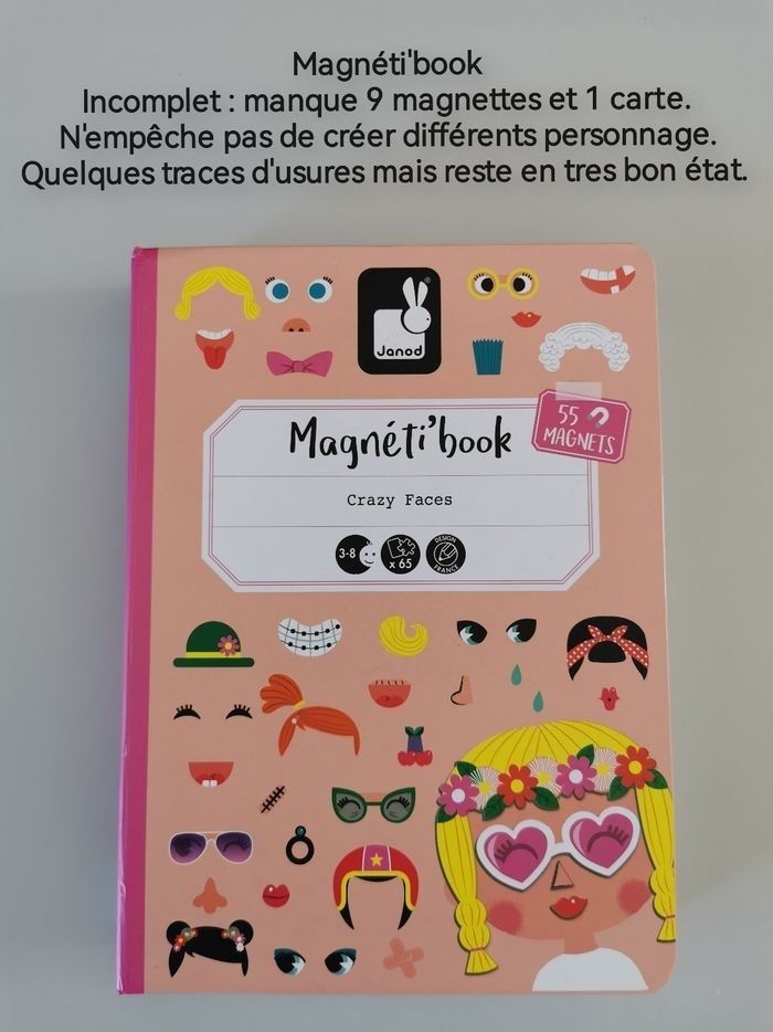Magnéti'book Incomplet : manque 9 magnettes et 1 carte. N'empêche pas de créer différents personnage. Quelques traces d'usures mais reste en tres bon état.