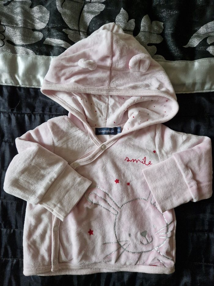 Gilet à pression avec capuche deux petites oreilles sur la tête . De couleur rose pâle.