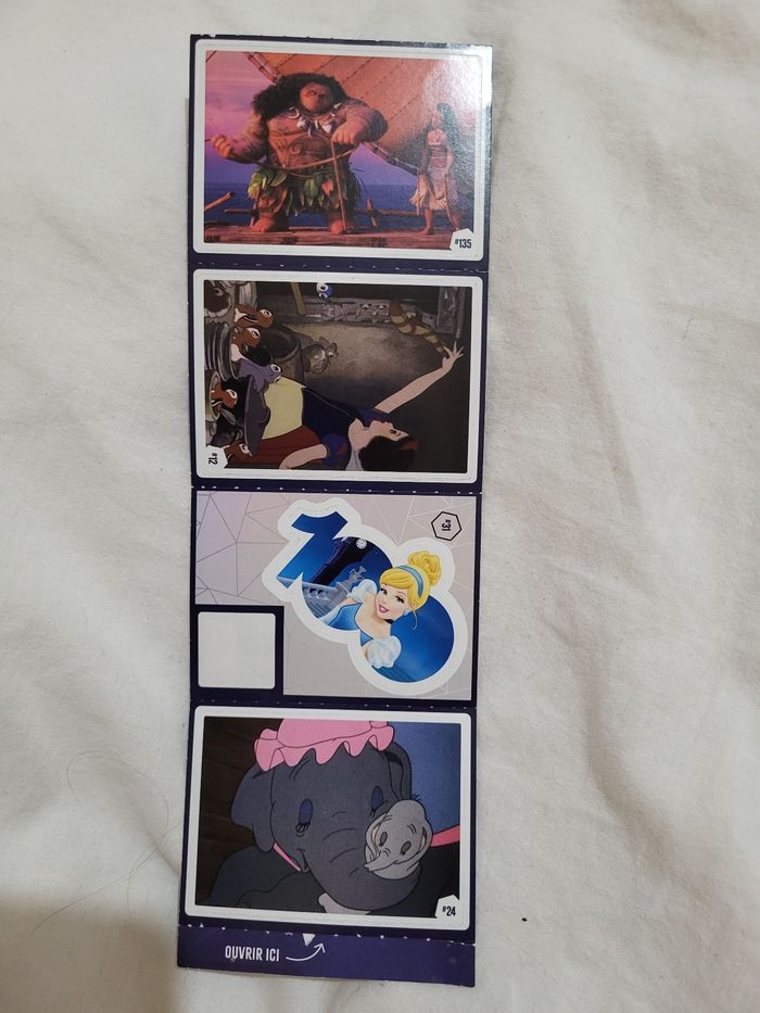 4 autocollants Disney 100 Auchan 2023 1 carte n°135 1 carte n°12 1 carte n°31 1 carte n°24 Attention il n'y a plus la vignette en bas