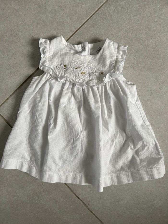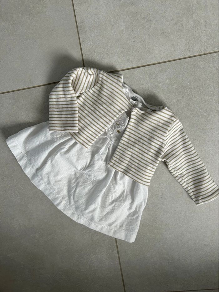 Robe + bloomer+ gilet Motif doré ( la photo ne rend pas bien ) Très bon état 6 mois