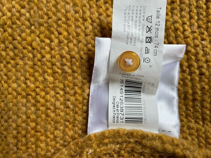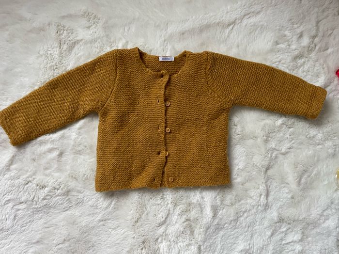 Gilet Bout’chou taille 12 mois. Couleur miel (entre moutarde et camel) Bon état car bouloché Pas de tâches ni trous