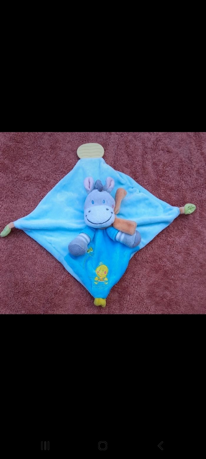 Doudou carré plat en velours de couleurs bleus 2 tons Zebre sur le milieu du doudou Anneau de dentition et attaché tétine sur le coin du doudou Poussin de couleur jaune brodé sur le doudou