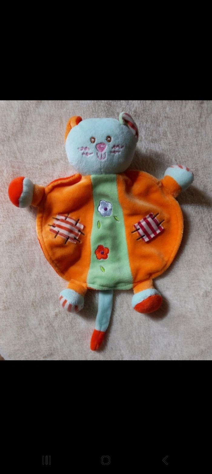 Doudou plat rond chat bleu - orange ,vert ,fleurs - Ajena