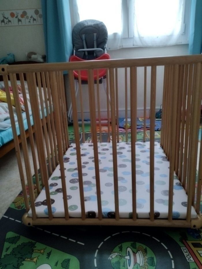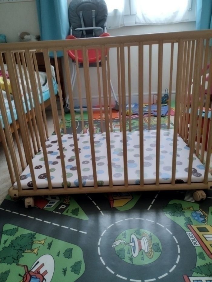 Vends parc Geuther à roulettes, en bois et réglable sur trois niveaux. En très bon état, servi trois mois .👍 La planche du fond n'est pas abîmé du tout.👍 Montage et démontage facile Dimensions : 96 cm × 76 cm. Visible et à retirer sur Besançon.