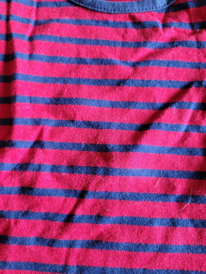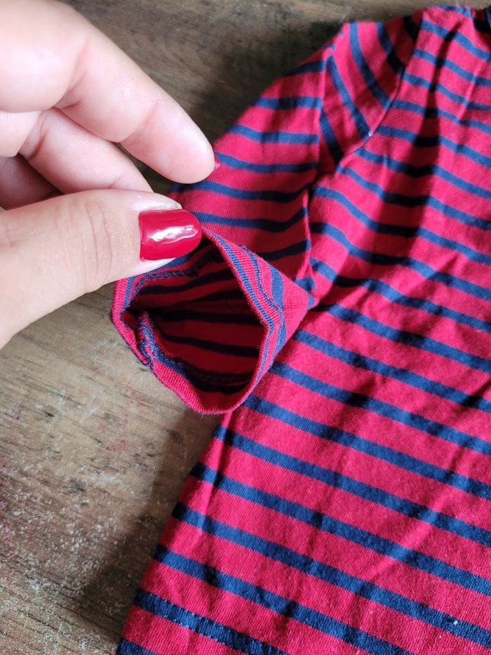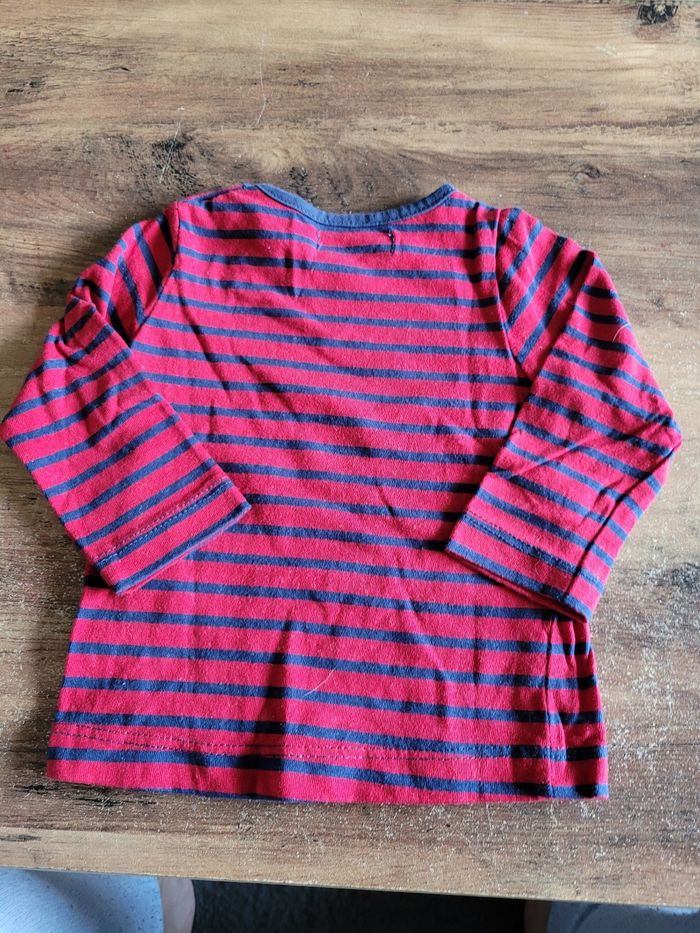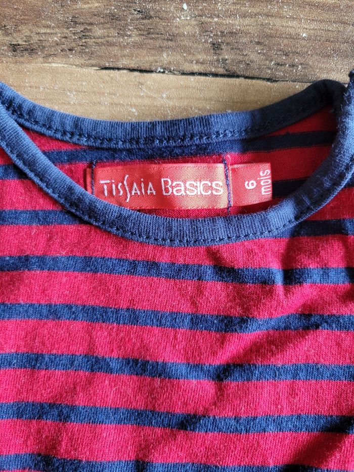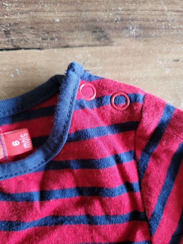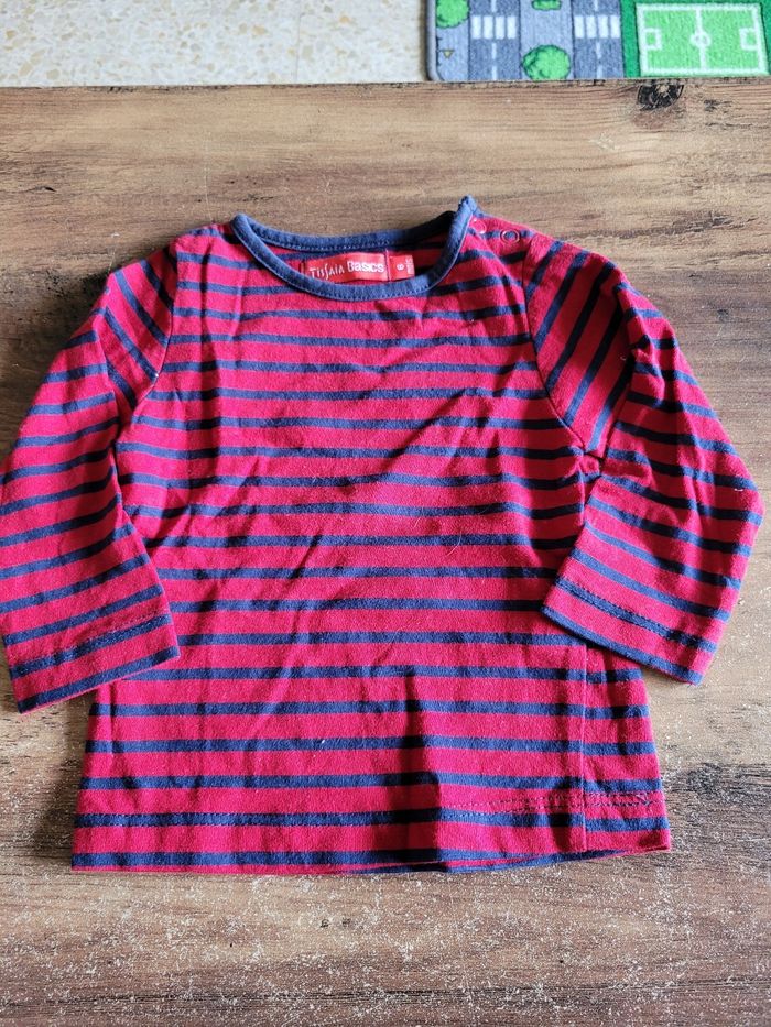 Petit T-shirt Manche longue Couleur rouge et bleu marine Mi saison Lège Taille 6 mois Attaché en haut a gauche Matière 100% coton