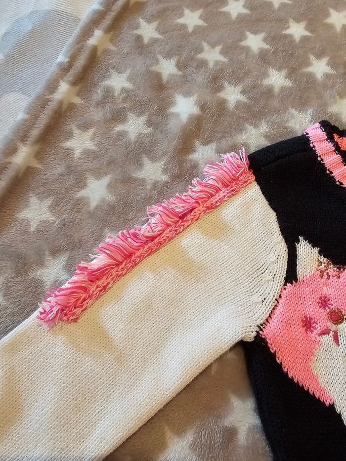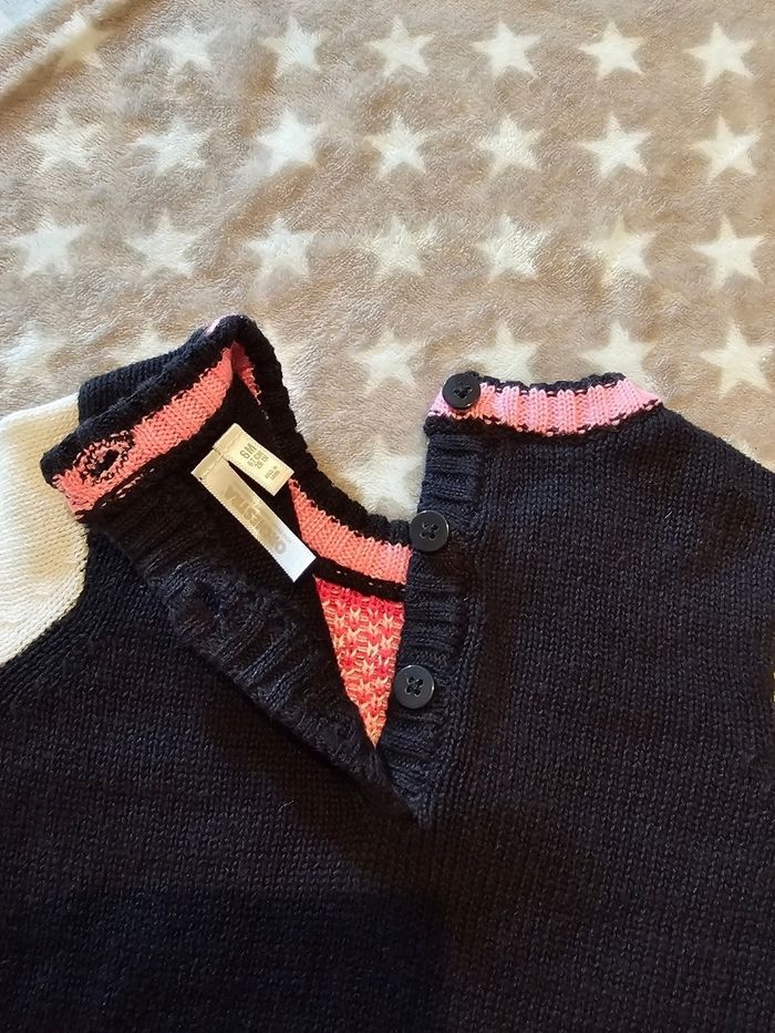 Jolie robe bleue marine, blanche et rose, avec licorne sur le devant. Détails brodés rose et doré. Franges sur la manche droite. Ouverture par trois boutons à l'arrière du col. Peu portée, elle est en très bon état hormis un minuscule accroc sur la manche gauche et deux autres encore moins visibles dans le dos (voir deux dernières photos). Taille 6 mois, marque Orchestra.