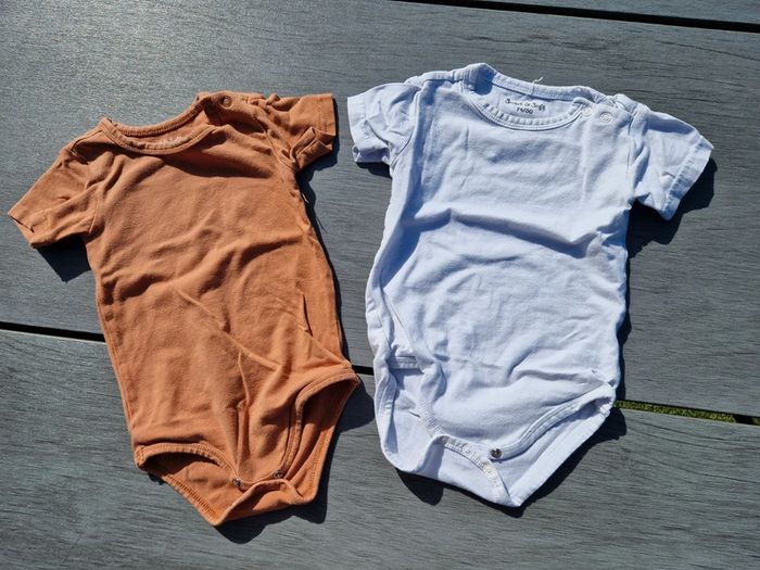 Lot de 2 bodies manches courtes Très bon état Taille 74 Maison non fumeur Tous les vêtements sont lavés, ils sont stockés au sec et à l'abri de la lumière