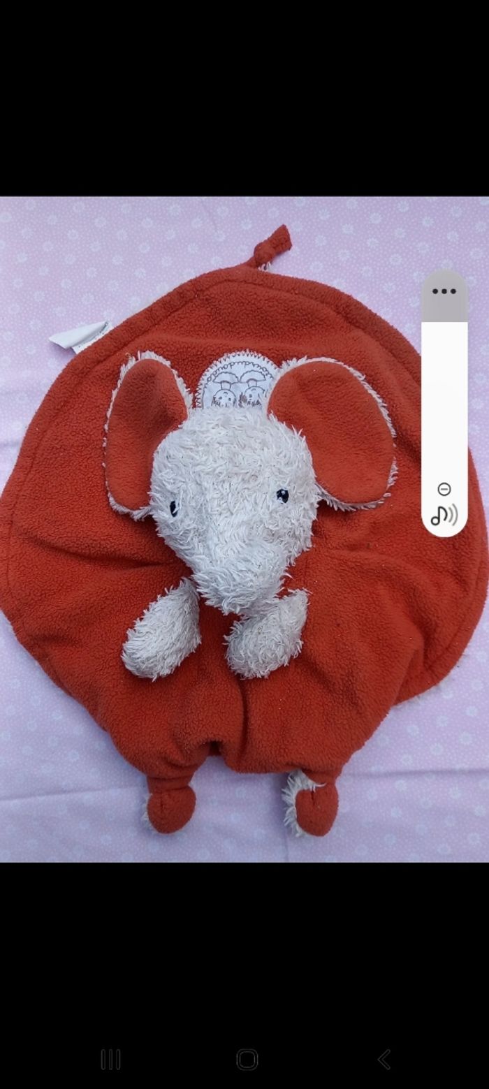 Doudou rond plat en velours polaire de couleur orange et de l'autre côté en velours poils de couleur blanc Éléphant sur le milieu du doudou Écusson enfants cousu sur le doudou 2 nœuds sur le devant du doudou