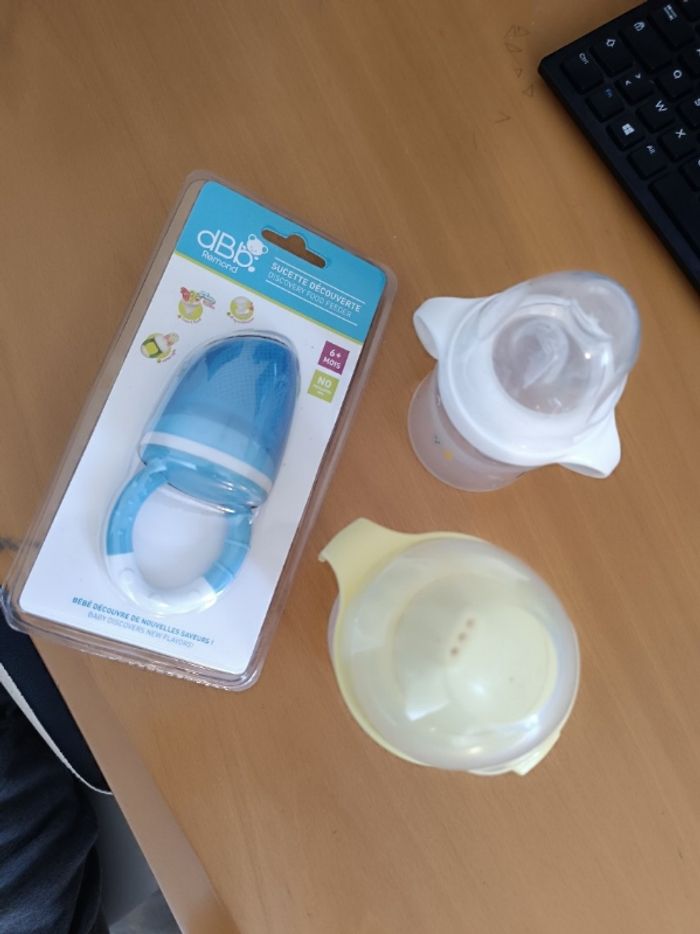 Biberon d'eau Tigex + Biberon d'eau Mam + sucette découverte achetée dans le magasin autour de bébé à Saintes 10 euros le lot