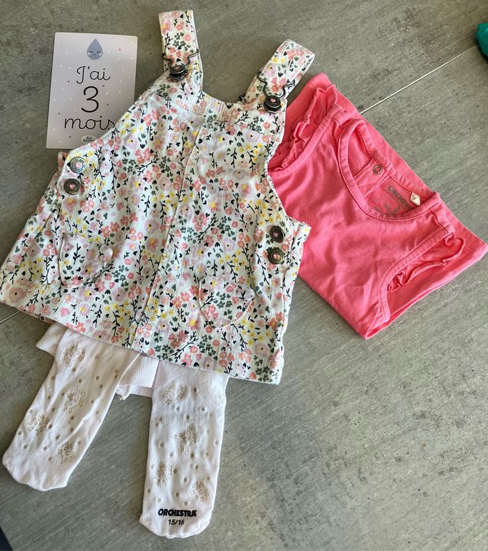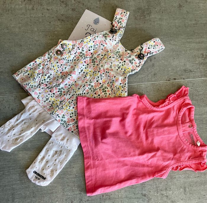 Ensemble robe salopette à fleurs tee shirt rose et collants fins à licornes paillettes rose très pâle Marque Orchestra pour le teeshirt et les collants et tex baby pour la robe Taille 3 mois pour la robe et le teeshirt et 15/16 pour les collants État: le tout est en très bon état, bon état pour les collants qui ont été portés plusieurs fois