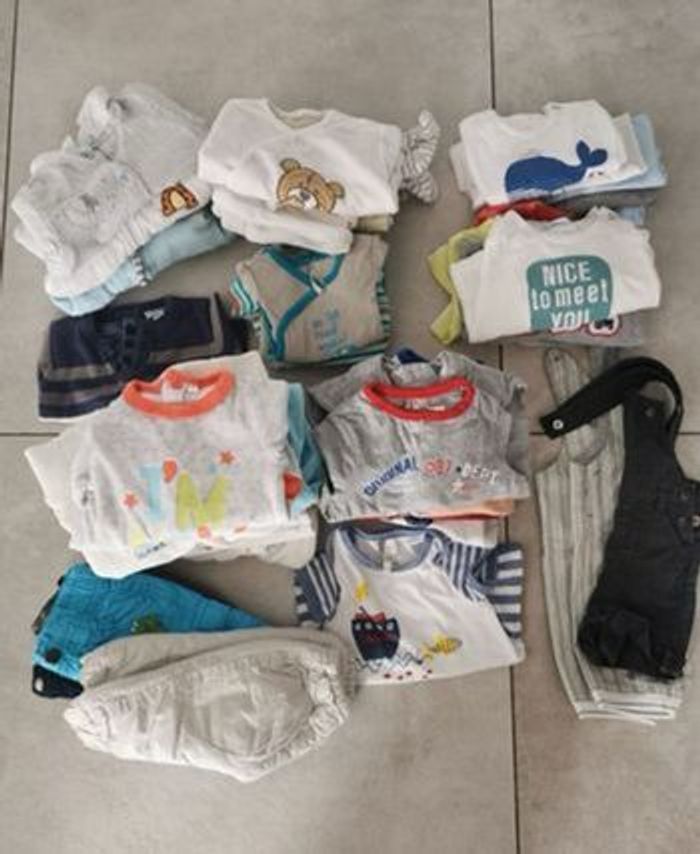 4 bodys manches courtes 7 pyjamas velours 5 pyjamas légers 3 ensembles 3 gilets 11t-shirts manches longues 1 pull 5 pantalons 2 salopettes 1 combishort été De toute marque en bon état