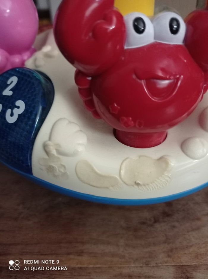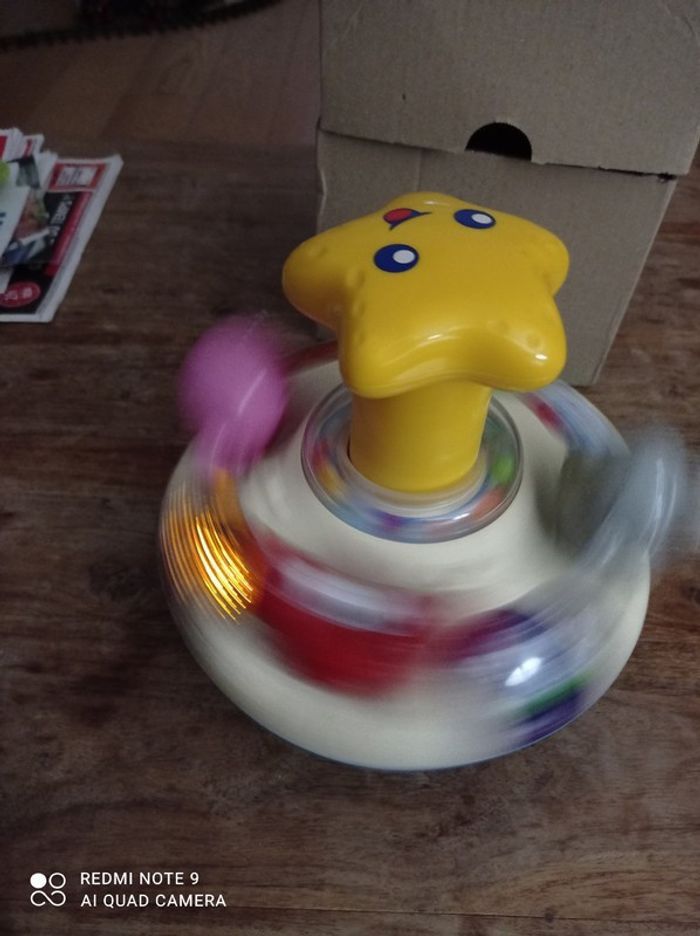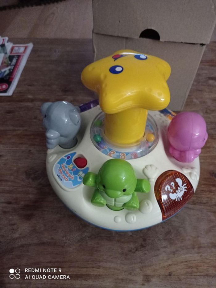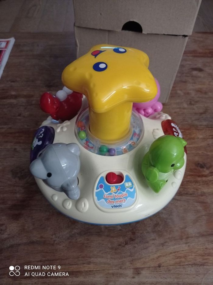 Une toupie musicale pour découvrir les animaux marins. Quand Bébé appuie sur la grande étoile de mer, la toupie tourne et tourne... et déclenche des sons rigolos, des phrases et une mélodie. 4 adorables animaux marins interactifs : quand Bébé les manipule, il apprend leur nom et leur couleur. 3 boutons lumineux clignotent en musique. Lorsque Bébé appuie sur l'un des 3 boutons, la toupie lui demande de retrouver un animal, sa couleur ou de compter les animaux. 2 modes : découverte et musical. 1 chanson et 8 mélodies.