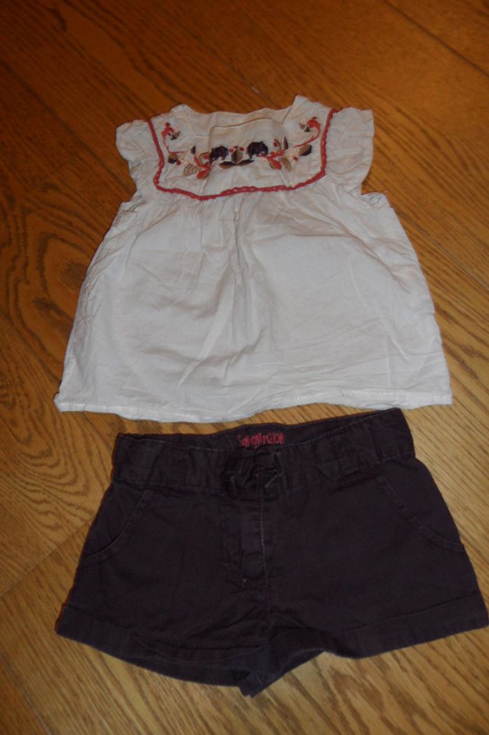 Très joli ensemble printemps-été (mi-saison) comprenant une tunique et un short violet assorti, marque sergent major, taille 18 mois (80-81 cm) très bon état maison non fumeur, sans animaux remise en mains propres secteur Lille Envoi lettre suivie pour 2 €