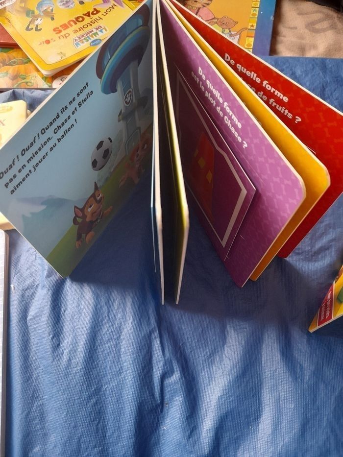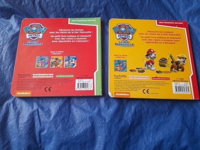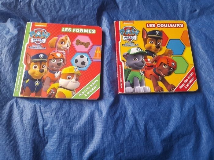 Vends livres pat patrouille un sur les formes le deuxième sur les couleurs Il y a une page qui est un peu plié mais n'empêche pas son fonctionnement