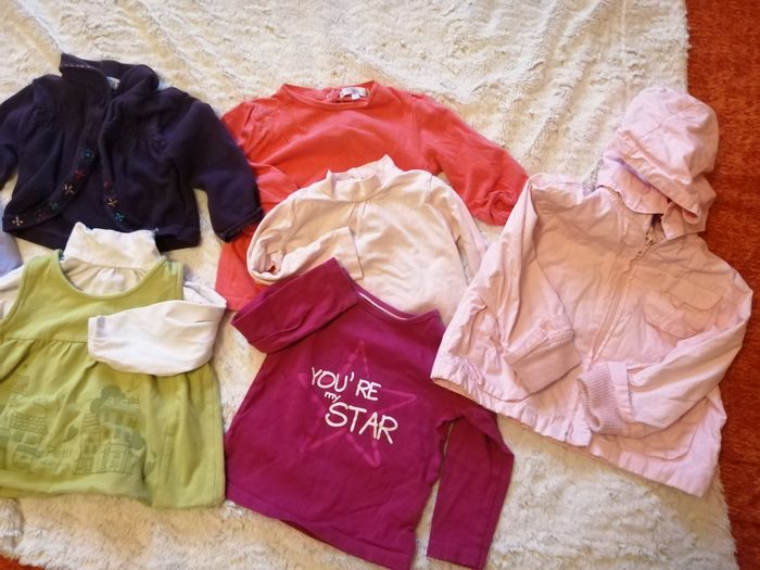 Lot de vêtements fillette 12 mois comprenant : 1 jegging Grain de Ble, 1 boléroet 1 tunique Sucre d'orge, 3 t-shirt manches longues, 1 parka avec capuche amovible, 2 hauts manches longues.