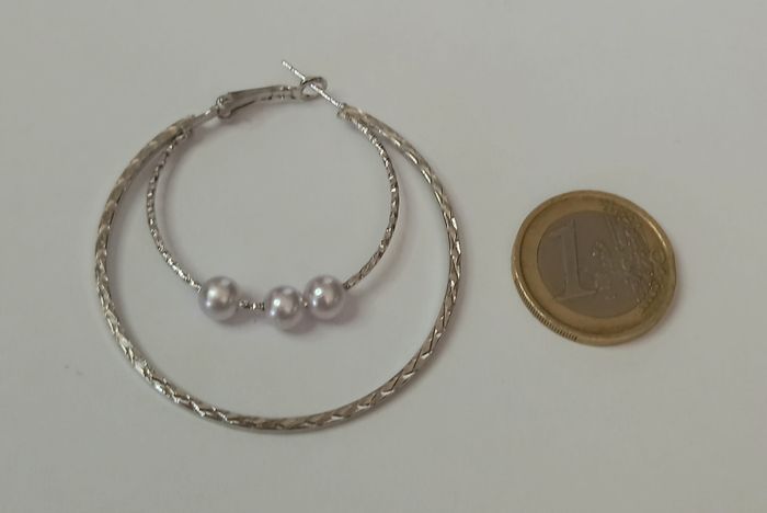 1 jolie paire de boucles d'oreilles double creoles. En alliage argenté, tres leger à porter. Boucles tres originales : la face exterieure est lisse et les cotés torsadés + 3 petites perles sur le plus petit anneau. Diametre des boucles : 5 cms N'hésitez pas à regarder mes autres ventes. Produit sous blister ! Envoi rapide et soigné
