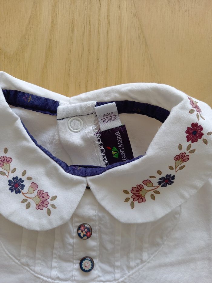 T-shirt blanc avec col Claudine à motif floral Fermeture par pression dans le dos En très bon état Sergent major taille 18 mois