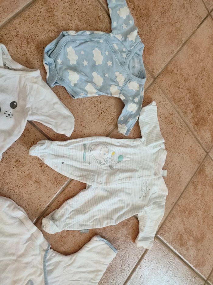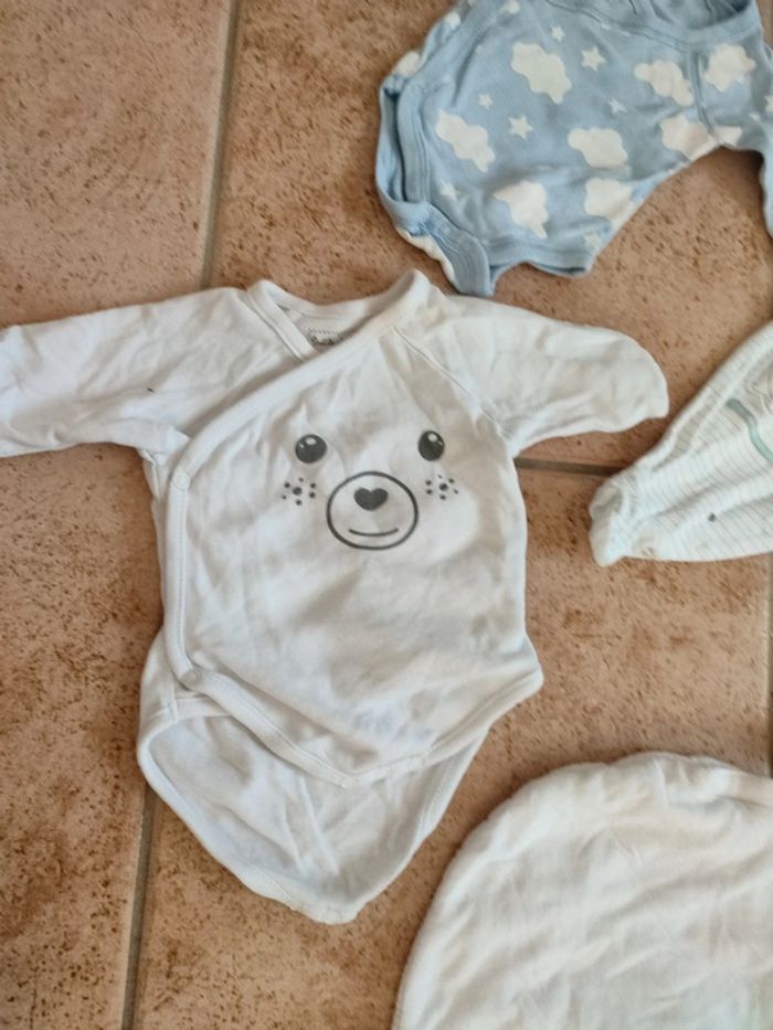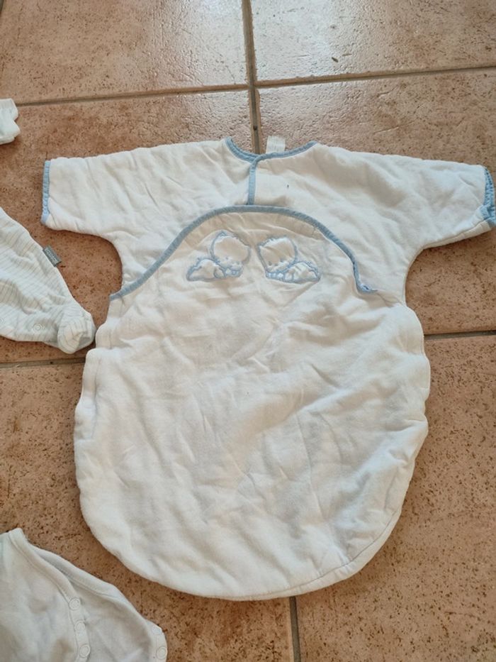 Body 00 mois et 1 mois (marque boîte a malice et kichoun) Pyjama 1 mois (marque absorba) Gigoteuse 00/1 mois (pas de marque) Très bon état. Quasi pas utilisé.