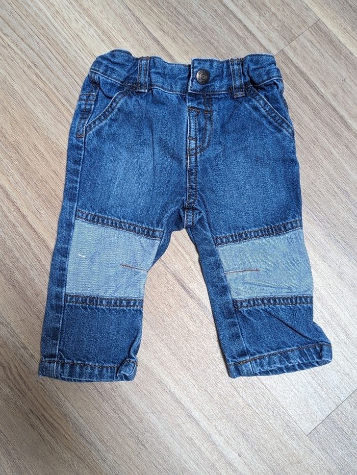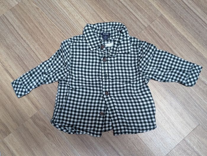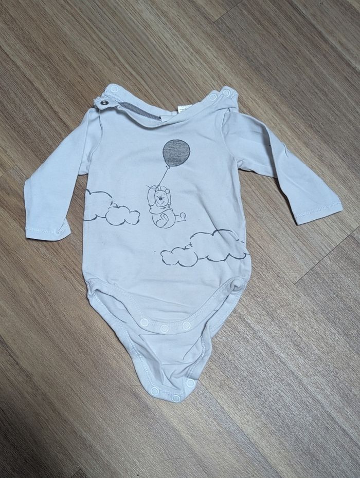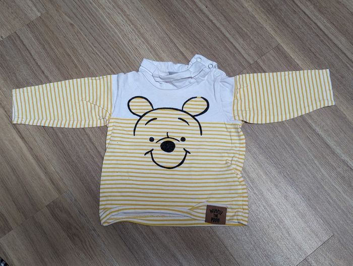 Lot de vêtements comprenant Un body H&M en état satisfaisant, un ensemble chemise et jean Kiabi en très bon état, un polo à col roulé DPAM et un polo Disney en bon état