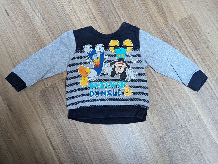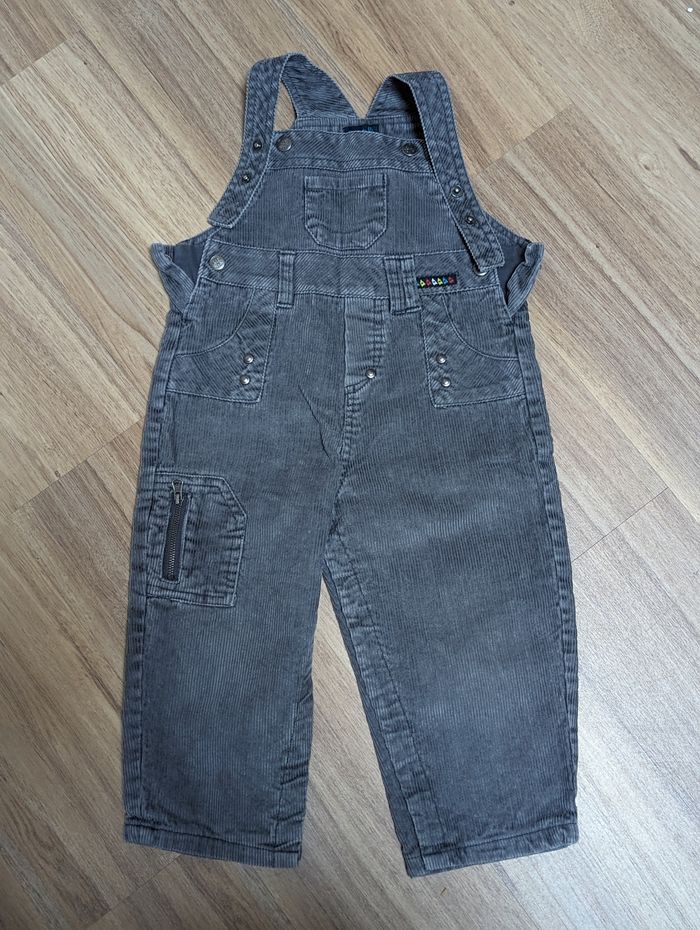 Lot de vêtements comprenant Une salopette grise côtelée grain de blé, Une salopette en jean et 3 tee-shirts manches longues orchestra Un pull c&a Mickey, un pull DPAM, avec quelques bouloches (voyez les photos) Un tee-shirt manches longues Gémo et un jacadi